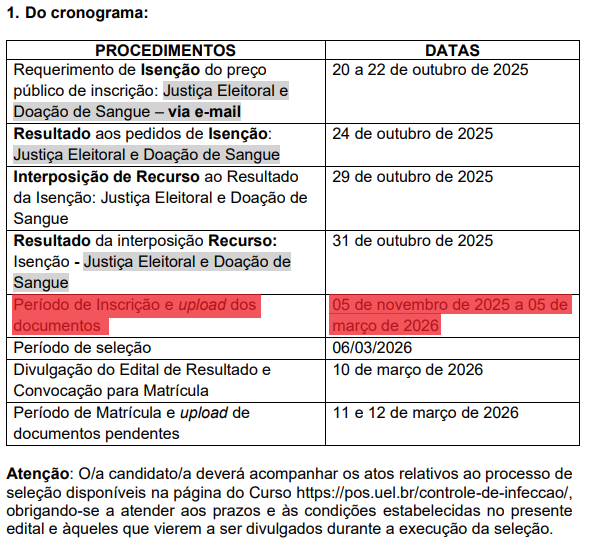As inscrições estarão disponíveis a partir de 05/11/2025 e serão realizadas somente via Sistema de Inscrição online, no endereço eletrônico da Pró-Reitoria de Pesquisa e Pós-Graduação.