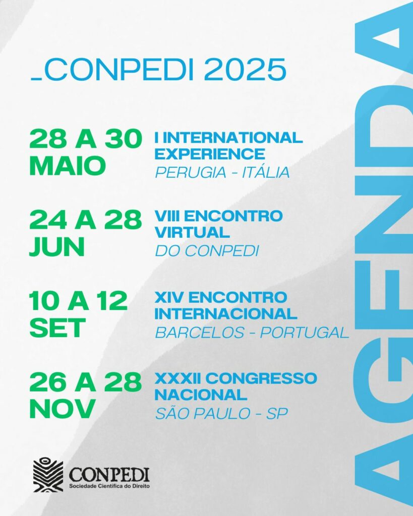 📌 28 a 30 de maio – I International Experience (Perugia, Itália) 📌 24 a 28 de junho – VIII Encontro Virtual do CONPEDI 📌 10 a 12 de setembro – XIV Encontro Internacional (Barcelos, Portugal) 📌 26 a 28 de novembro – XXXII Congresso Nacional (São Paulo, SP)