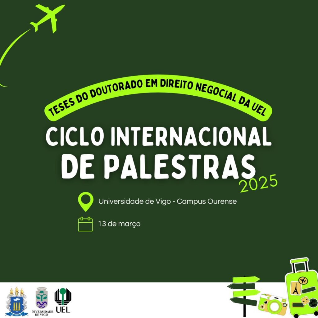O Programa de Pós-Graduação em Direito Negocial da Universidade Estadual de Londrina (PPGDN-UEL) continua ampliando sua projeção internacional. No próximo dia 13 de março de 2025, a Universidade de Vigo – Campus Ourense, na Espanha, receberá os doutorandos da UEL para o Ciclo Internacional de Palestras.