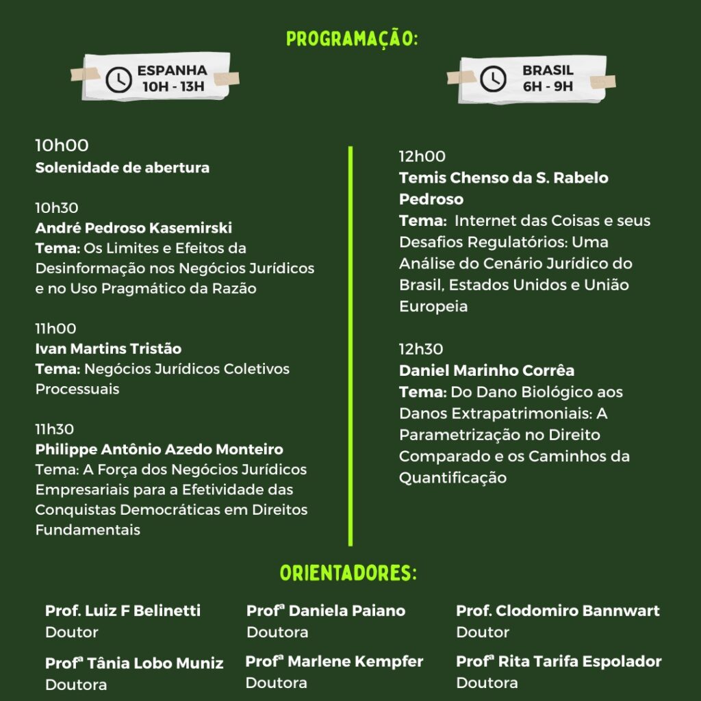 🔹 10h00 – Solenidade de Abertura 🔹 10h30 – André Pedroso Kasemirski 📌 Tema: Os Limites e Efeitos da Desinformação nos Negócios Jurídicos e no Uso Pragmático da Razão