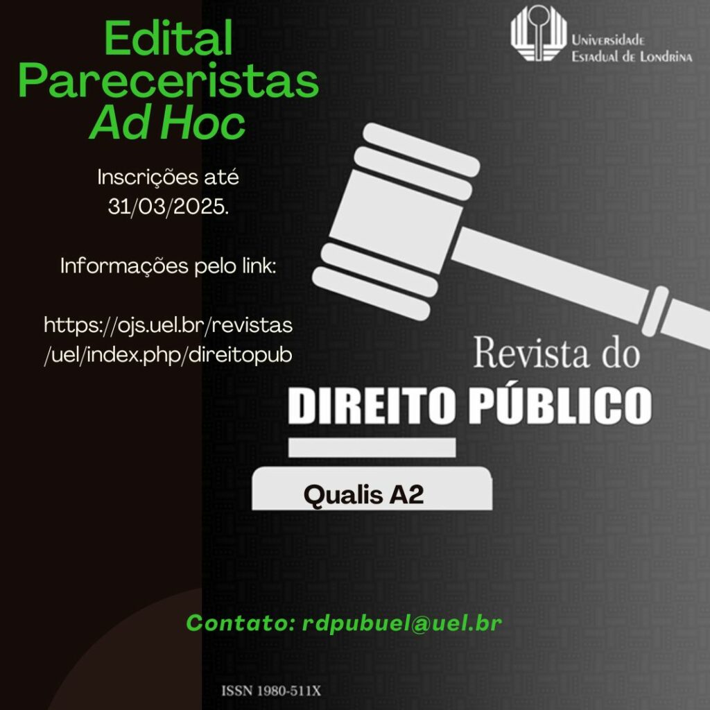 A Revista do Direito Público (RDP), vinculada ao Programa de Mestrado e Doutorado da Universidade Estadual de Londrina (UEL), está em busca de pareceristas