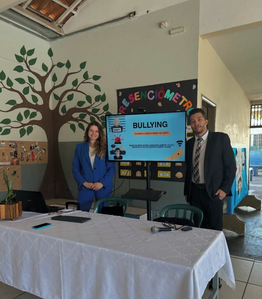 No dia 7 de abril, em alusão ao Dia Nacional de Combate ao Bullying e à Violência nas Escolas, os mestrandos Maria Eduarda Gobbo Andrades e Matheus Filipe de Queiroz, do Programa de Pós-Graduação em Direito Negocial da Universidade Estadual de Londrina (PPPGD/UEL), ministraram uma palestra no Colégio Estadual Theothôlio Brandão Vilela, em Ibiporã (PR).