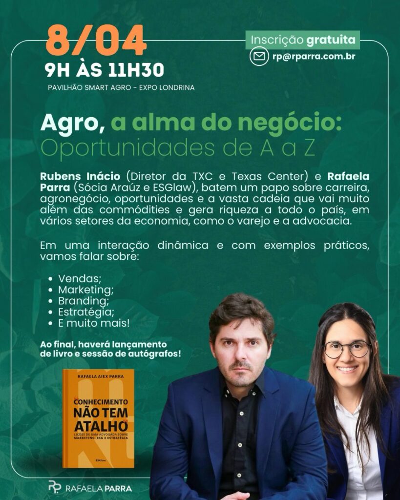 Ao lado de Rubens Inácio, diretor da TXC e Texas Center, Rafaela Parra trará uma abordagem prática e estratégica sobre o universo do agronegócio, revelando como essa cadeia vai além das commodities, alcançando setores como o varejo e a advocacia. O bate-papo promete insights sobre carreira, marketing, branding, estratégia e vendas, com foco nas oportunidades que o agro oferece para diferentes perfis profissionais.