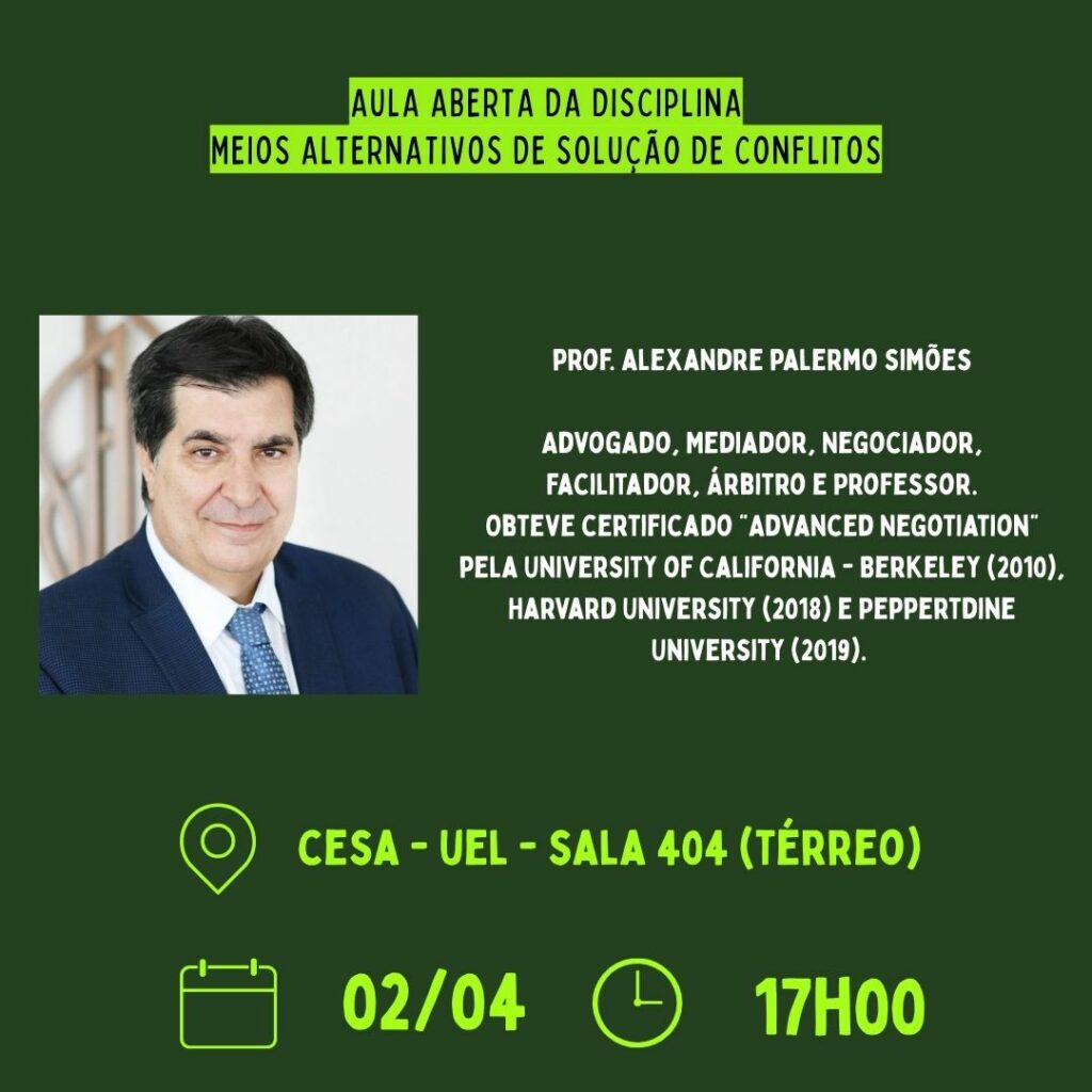 No dia 2 de abril, às 17h, a Universidade Estadual de Londrina (UEL) promoveu uma aula aberta da disciplina “Meios Alternativos de Solução de Conflitos”, com a participação especial do renomado professor Alexandre Palermo Simões. O encontro aconteceu na Sala 404 do CESA (térreo) e reuniu estudantes, docentes e profissionais interessados em métodos eficazes de resolução de disputas.