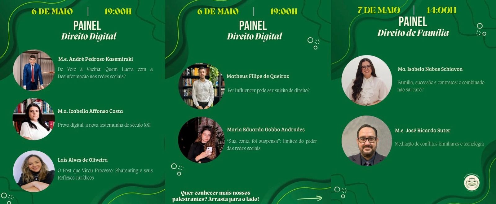 A participação do Programa de Pós Graduação em Direito Negocial da UEL ocorreu em 3 painéis realizados no decorrer do evento. No dia 06 de maio, no painel de Direito Digital, participaram os mestrandos Maria Eduarda Gobbo Andrades, Lais Alves de Oliveira, Matheus Filipe de Queiroz e os doutorandos Izabella Affonso Costa e André Pedroso Kasemirski. No painel de Direito de Família, realizado dia 07 de maio, estiveram presentes os Doutorandos Isabela Nabas Schiavon e José Ricardo Suter e a egressa Cássia Pimenta Meneguce. No painel de Direito Ambiental, realizado em 08 de maio, estiveram presentes os Doutorandos Bruna Faria, Eduardo Bueno e as egressas Márcia Hiromi Cavalcanti e Viviana Samara Yoko Matsui.