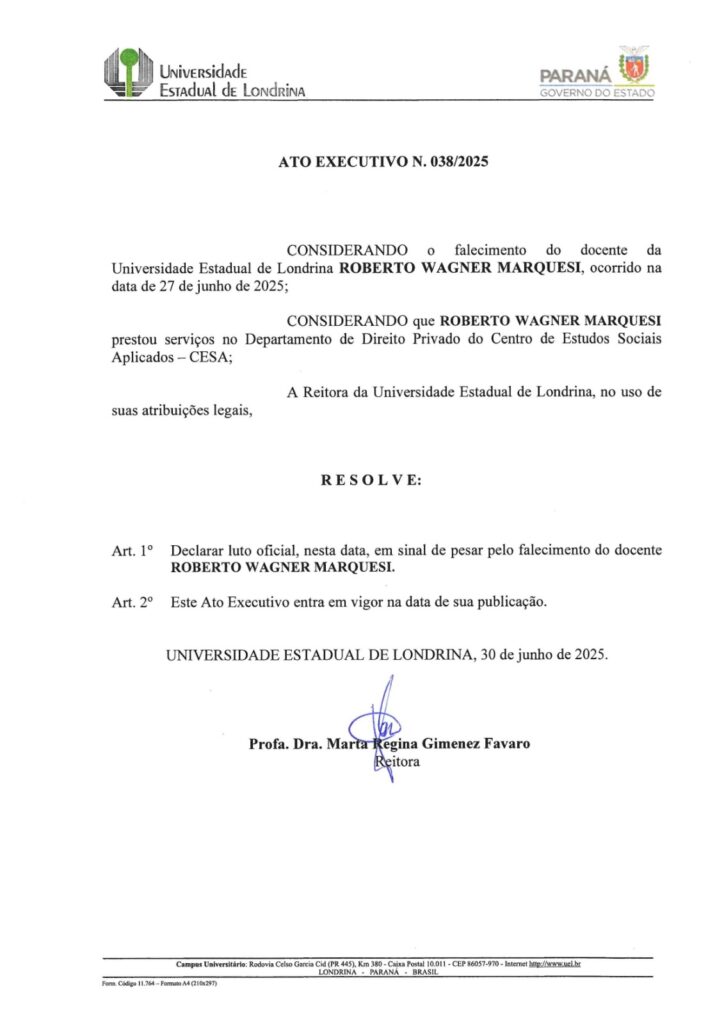 Em reconhecimento à sua dedicação e à sua história construída dentro da Universidade, especialmente junto ao Departamento de Direito Privado do CESA e ao nosso Programa de Pós-Graduação, a Reitoria da UEL declarou luto oficial por meio do Ato Executivo n.º 038/2025, publicado em 30 de junho de 2025.