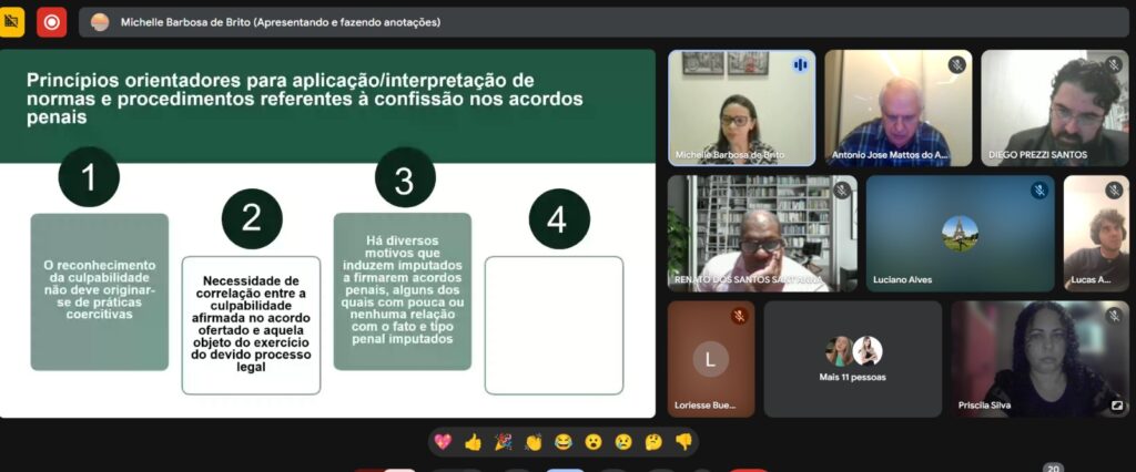 No dia 9 de junho, o PPGDN recebeu a professora Michelle Barbosa Brito, doutora pela UFPA, que ministrou a aula intitulada “Acordos penais e a verdade: uma leitura a partir de Luigi Ferrajoli”. Na sequência, os discentes apresentaram seminários expositivos, com maior destaque, entre as exposições, argumentou-se que o STF também atua com base no garantismo penal, teoria desenvolvida por Luigi Ferrajoli, que busca equilibrar a atuação estatal com os direitos individuais, superando o positivismo jurídico. As atividades estavam sob a supervisão dos professores Antonio José Mattos Amaral e Diego Prezzi.