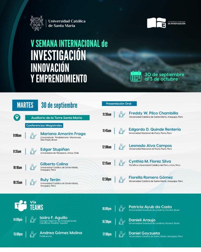 Vice-coordenadora do PPGDN participa da V Semana Internacional de Investigacion, Innovacion y Emprendimento da Universidade católica de Santa Maria, Arequipa/PERU.