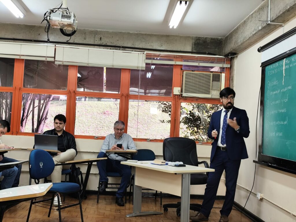 O Professor Rudá Ryuiti Furukita Baptista é Mestre em Direito Negocial pela Universidade Estadual de Londrina, Doutor pela Universidade Federal de Santa Catarina e professor da Pontifícia Universidade Católica do Paraná (PUCPR) Campus Londrina. Ele ministrou aula sobre “Direito internacional na contemporaneidade”, na disciplina Estado e Economia na Contemporaneidade, contribuindo com reflexões críticas sobre a temática.