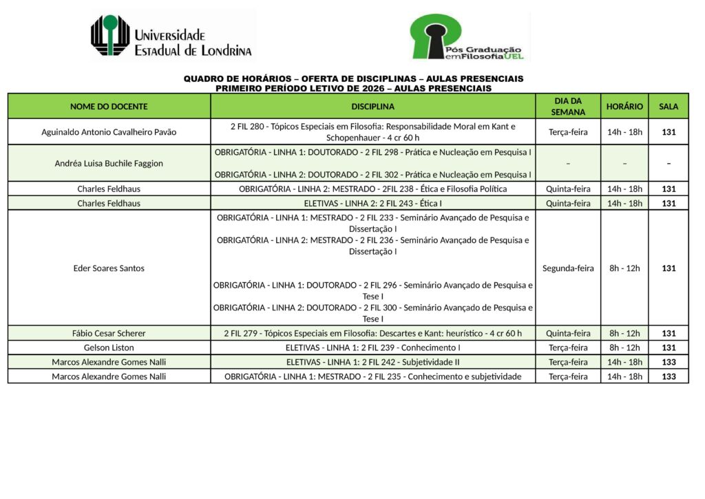 Os professores do Programa de Pós-graduação em Filosofia da Universidade Estadual de Londrinam lecionam as seguintes disciplinas no primeiro semestre de 2026 e a tabela abaixo também informa o horário e a sala em que a disciplina está acontecendo.