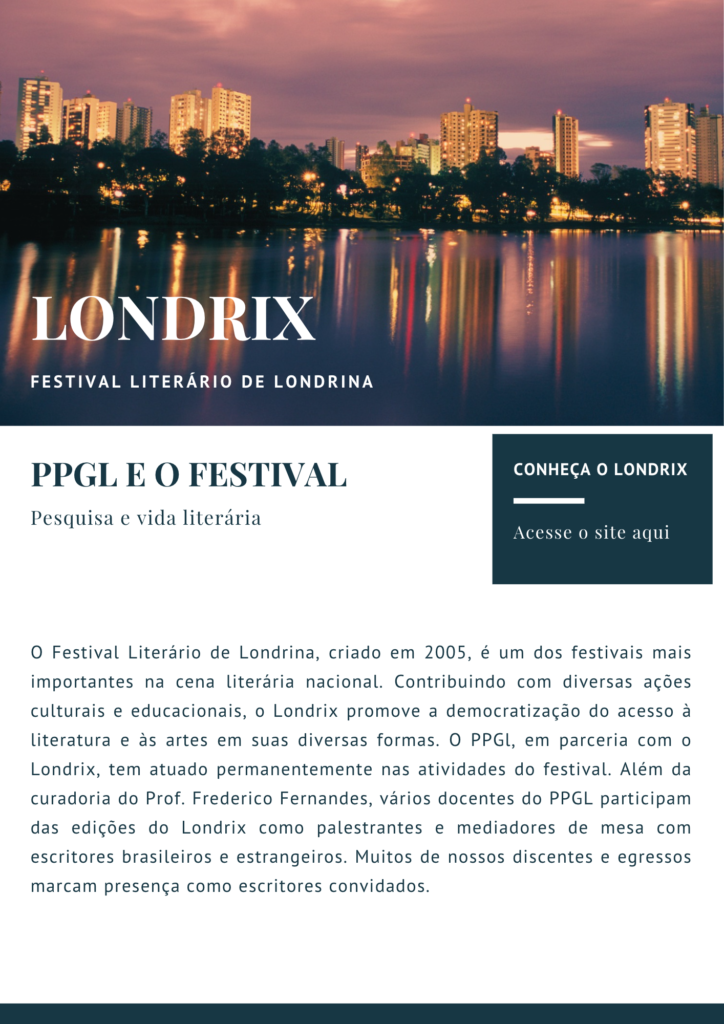 O PPG em Letras da UEL tem atuado em diversas atividades socioculturais e colaborado com importantes projetos educativos promovidos pela Secretaria de Cultura de Londrina. Docentes e discentes participam ativamente das edições da Semana Literária do SESC-PR, do Londrix (Festival Literário de Londrina) e do Projeto Literatura na Biblioteca, projeto em parceria com a Biblioteca Pública de Londrina. Muitos docentes e discentes do PPGL participam de mostras e projetos ligados à cultura local, regional e nacional.